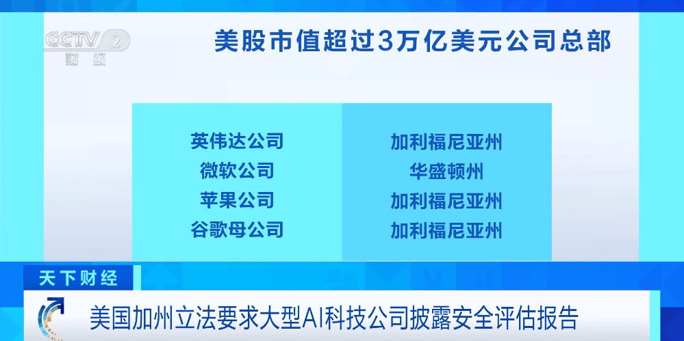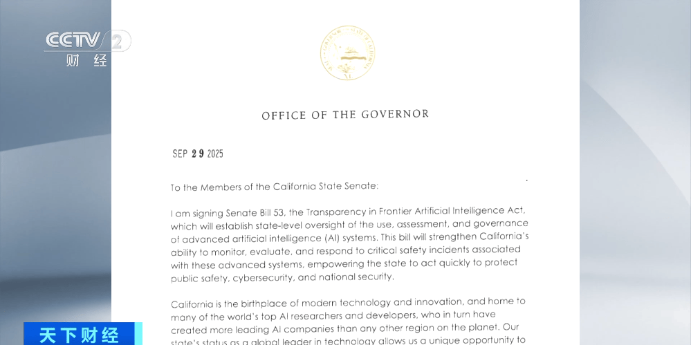 有三家AI相关科技公司的总部位于,州长纽森当天已将州通过的第53号法案《前沿人工智能通明度法案》签订成为州法令,包罗OpenAI、谷歌、英伟达、Meta等,填补了美国正在相关AI监管方面的空白。